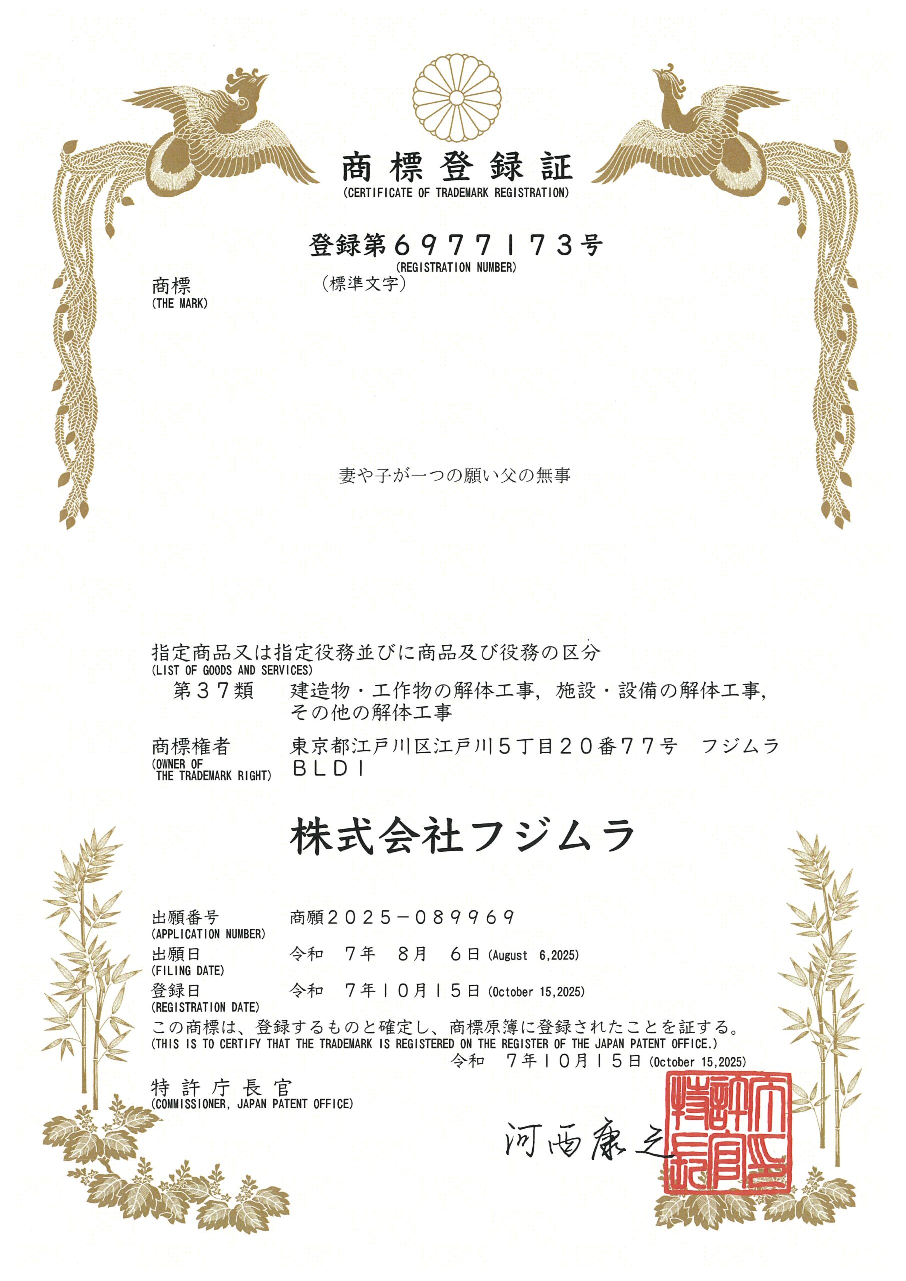 弊社は、創業者 藤村洋輔が昭和52年の創業以来掲げてきた企業理念の「妻や子がひとつの願い父の無事」を、会社の大切な財産として守り、次世代へと継承していくため、令和7年8月6日に商標登録出願し、令和7年10月15日に特許庁より商標登録として認定されました。